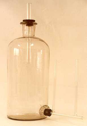 Aplicaciones didácticas: Se realiza en primer lugar la experiencia anteriormente descrita, apreciándose una velocidad de efusión constante para el agua (un chorrito de agua cuyo perfil no varía con el tiempo). En un segundo momento, se retira el tubo vertical y se repite la experiencia, apreciándose una velocidad de efusión que disminuye con el tiempo (el perfil varía y el agua tiene menor alcance). Hemos encontrado otras aplicaciones didácticas más elaboradas para el Frasco de Mariotte, que pueden encontrarse en el apartado de investigación. |