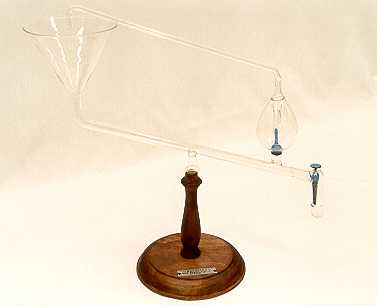 El ariete hidráulico es una máquina destinada a la elevación de las aguas de los ríos, cuya potencia procede de su propia corriente. Fue inventada por Mongolfier al observar que el agua de los arroyos o de los torrentes, al chocar contra los obstáculos que encuentran en su movimiento, se elevan a tanta mayor altura sobre el nivel de las mismas, cuanta más grande es la velocidad con que lo verifican. Observando la maqueta de la fotografía, vemos en la parte superior izquierda un embudo que sirve de recipiente o contenedor desde el que se inicia el movimiento del agua a través del tubo recto descendente que termina (derecha abajo) en una válvula (en azul). Esta válvula permanece abierta por su propio peso cuando la corriente es débil, por lo que se produce la salida del agua al exterior a través de la abertura donde encaja. Sin embargo, a medida que aumenta la velocidad, la válvula sufre una presión creciente de abajo arriba que llega a levantarla de manera que sella momentáneamente la abertura. En este momento, la acumulación del agua bruscamente detenida, produce inmediatamente la transformación de su energía cinética en energía de presión, que eleva una pequeña cantidad de agua a través de la sección vertical de tubo que conecta con un segundo receptáculo; aquí encontramos una segunda válvula (en azul) donde se repite el proceso anteriormente descrito, de manera que esta segunda válvula produce a su vez la elevación de agua a través de un tubo de vidrio que circula paralelo y por encima del que nace del embudo. Como consecuencia de la acción de este ariete hidráulico de dos etapas, el agua contenida en un recipiente (embudo) es elevada y vertida a mayor altura sobre éste. Aplicaciones didácticas: Para poner en funcionamiento el ariete, es necesario verter agua por el embudo con lentitud hasta que el agua alcance el receptáculo donde se encuentra la segunda válvula; entonces se continua el llenado con lentitud hasta que el agua alcance borde del embudo; en ése momento se pone en marcha el ariete dando un golpecito con un dedo a la válvula de la primera etapa (situada más a la derecha en la fotografía), observándose la elevación y vertido de agua a través del tubo superior mientras ambas válvulas se alteran en su movimiento de apertura y cierre automáticamente. |
