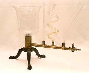 Consta de un gran vaso de vidrio que conecta en su parte inferior con un tubo horizontal, provisto de llave, al cual pueden acomodarse un tubo recto, otro sinuoso y otro oblicuo. Estos vasos comunicantes se utilizan para mostrar lo que se conoce como paradoja hidrostática. Llenos los vasos con agua coloreada se aprecia que el nivel de agua es el mismo en todos los recipientes con independencia de su forma. A priori, se podría pensar que la presión en el recipiente mayor es más elevada y que, como consecuencia de esta presión, el agua debería alcanzar mayor altura en los recipientes más pequeños. Sin embargo, la presión depende sólo de la profundidad y, por tanto, el líquido se encuentra a la misma altura en todas las partes del recipiente, como se confirma experimentalmente. Esta propiedad sobre la presión ejercida en el seno de un líquido es evidenciada tanto por el aparato de Haldat como por el dinamómetro hidrostático de Pellat. Aplicaciones Didácticas: Con la llave cerrada, se llenan los vasos comunicantes con agua coloreada. Una vez observado el fenómeno se abre la llave desalojando el líquido. |