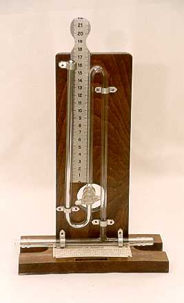 El manómetro de vacío está destinado a medir presiones absolutas inferiores a la atmosférica. En concreto, este dispositivo se utiliza para medir presiones absolutas muy bajas, de tan sólo 10 o 15 mm de mercurio, por lo que es muy útil para cuantificar el vacío que se logra en el interior de un recipiente. Consta de de un tubo de vidrio cerrado por un extremo y doblado en forma de S, de forma que el otro extremo conecta con un tubo horizontal destinado a tomar el gas cuya presión se desea medir. El mercurio se ha introducido en el manómetro con la precaución de que descanse sobre el extremo cerrado del tubo, lo que asegura que la superficie libre de mercurio que apoya en él se encuentra siempre a presión cero. Una llave situada en la parte central del tubo se mantiene habitualmente cerrada para evitar la pérdida del mercurio y sólo se abre en el momento de la medida. Para medir, se tapa uno de los extremos del tubo horizontal de vidrio, mientras que el otro extremo se conecta al gas objeto de estudio; finalmente, se abre la llave. La diferencia de niveles de las dos superficies libres del mercurio, leída sobre una escala graduada en milímetros, nos da la presión absoluta del gas. Aplicaciones didácticas: Primeramente, se lubrica la llave de paso con vaselina para evitar la entrada de aire en el tubo, con el consiguiente riesgo de expulsión de mercurio hacia la bomba de vacío. A continuación, se tapa uno de los extremos del tubo horizontal de vidrio, mientras que el otro extremo se conecta mediante un tubo de goma a una bomba de vacío; seguidamente, se abre la llave. Se aprecia el movimiento del mercurio en el tubo de vidrio hasta que alcanza una posición estacionaria. La diferencia de niveles de las dos superficies libres del mercurio, leída sobre una escala graduada en milímetros, es el valor del vacío logrado por la bomba. |