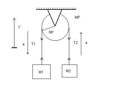 a) Movimiento de la masa M1: T1 - M1·g = -M1·a(lin) b) Movimiento de la masa M2: T2 - M2·g = M2·a(lin) c) Movimiento de la polea MP: T1·RP - T2·RP = 1/2·MP·RP·RP·a(ang) que se puede reescribir, haciendo operaciones, como: T1 - T2 = 1/2· MP· a(lin) donde a(lin) representa la aceleración lineal y a(ang) la aceleración angular. combinando a), b) y c) se llega fácilmente a que: g = [(M1 + M2 + 1/2·MP)/(M1 - M2)]·a(lin) lo que permite calcular g si se mide la aceleración a(lin). La clave se encuentra en observar que a(lin)<<g, por lo que es mucho más fácil de medir a(lin) que g al ser el movimiento más lento. Efectivamente, despejando se obtiene: a(lin) = [(M1 - M2)/(M1 + M2 + 1/2·MP)]·g de manera que